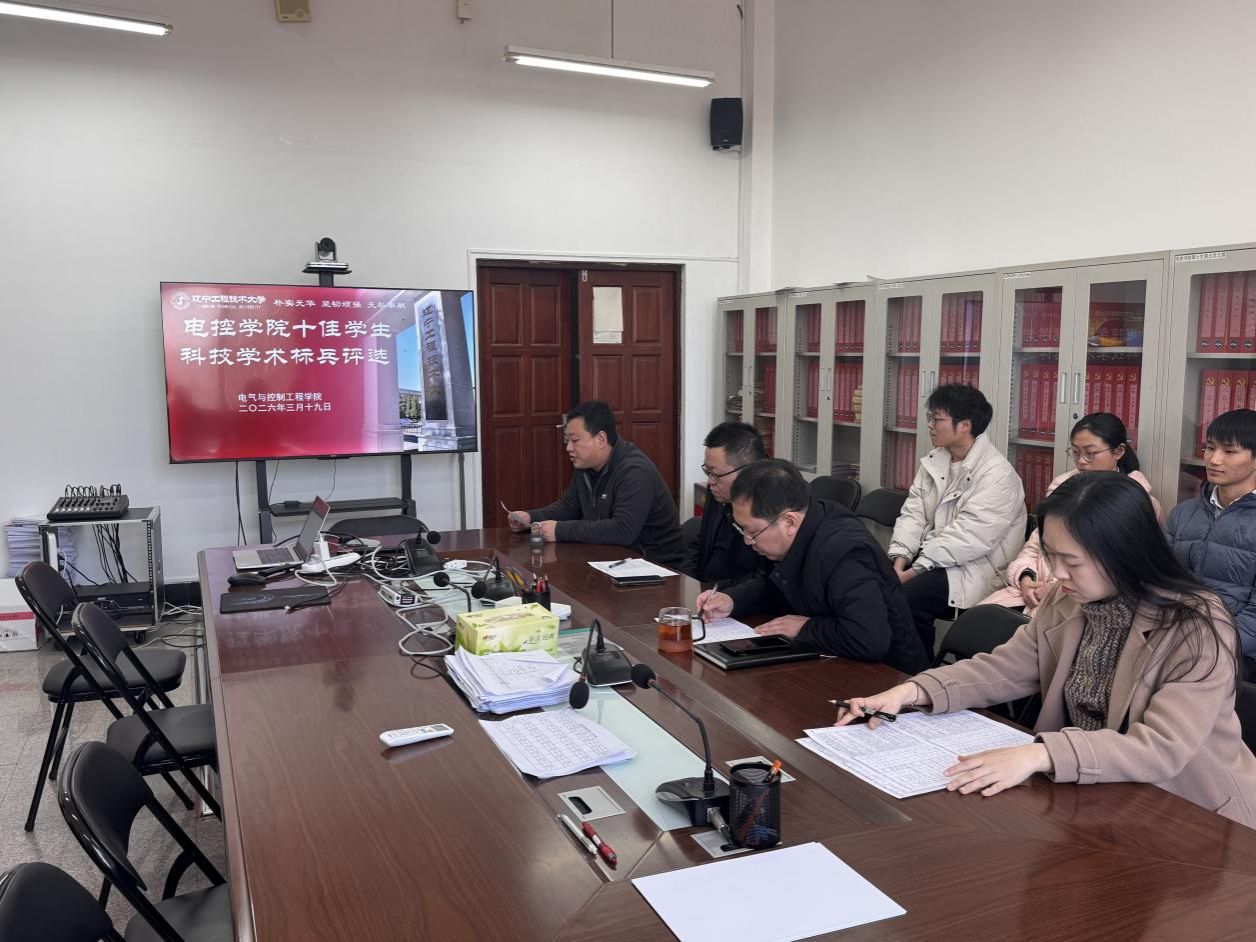 (通讯员 张新鑫)3月19日12时,电控学院于静远楼225开展“十佳学生科技学术标兵”评选活动。学院党委书记田国胜、副书记周筱淋、副院长杨桢、研工部主任杨姝航、团委书记张新鑫担任评委,活动旨在选树学术科研典范,发挥朋辈引领作用,培育学生创新精神与学术素养。