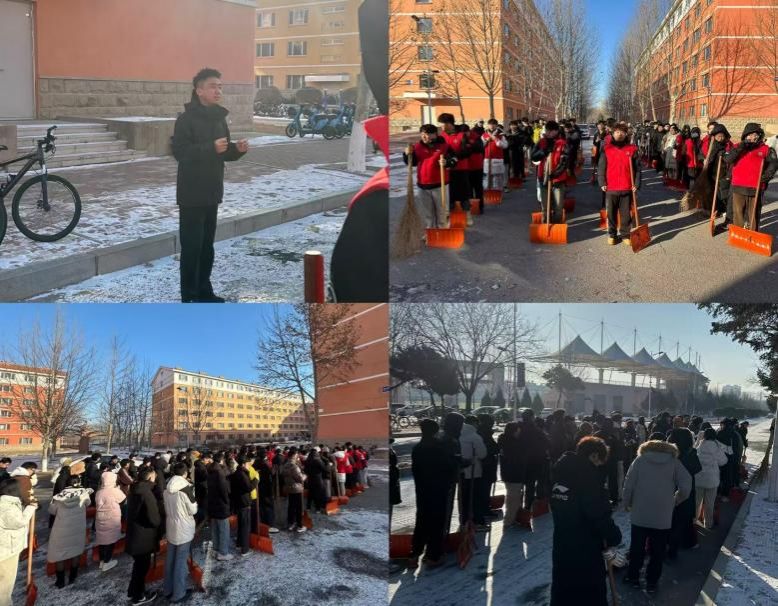 扫雪前,汤文涛老师召开现场部署会,精准分配校内任务并着重强调安全注意事项,提醒大家规范使用工具、避免滑倒摔伤。