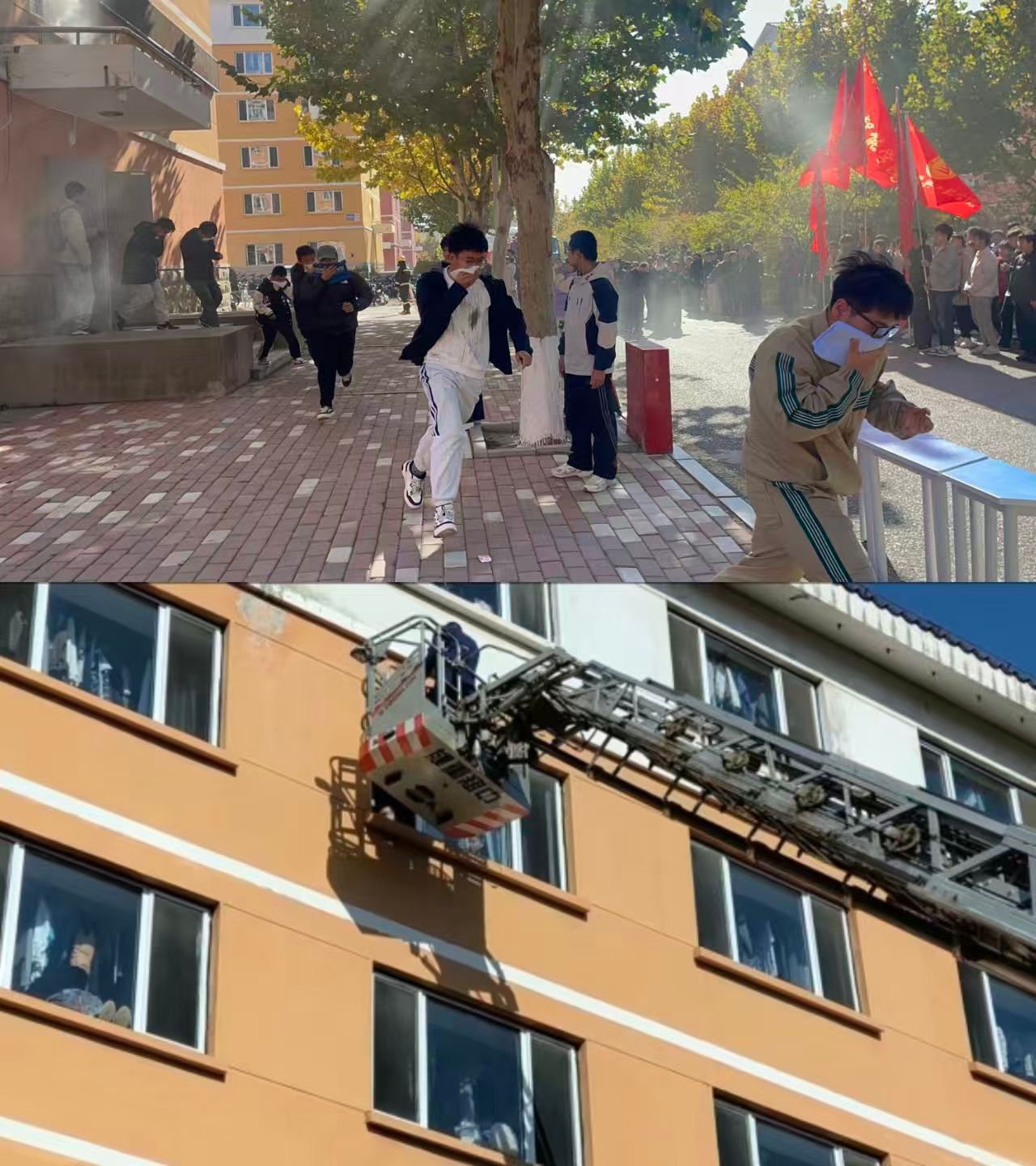 疏散完毕后,带队老师向总指挥报告:“电控学院已紧急疏散师生600人,目前1人被困,无人员受伤。”总指挥立即下达指令:“请消防大队实施救援!”消防救援人员迅速操作云梯车升空,精准抵达高层位置。救援人员系好安全绳,俯身探向“被困”同学,稳妥将其护入救援篮内,随后平稳降落至地面。整个救援过程迅速规范、配合有序。