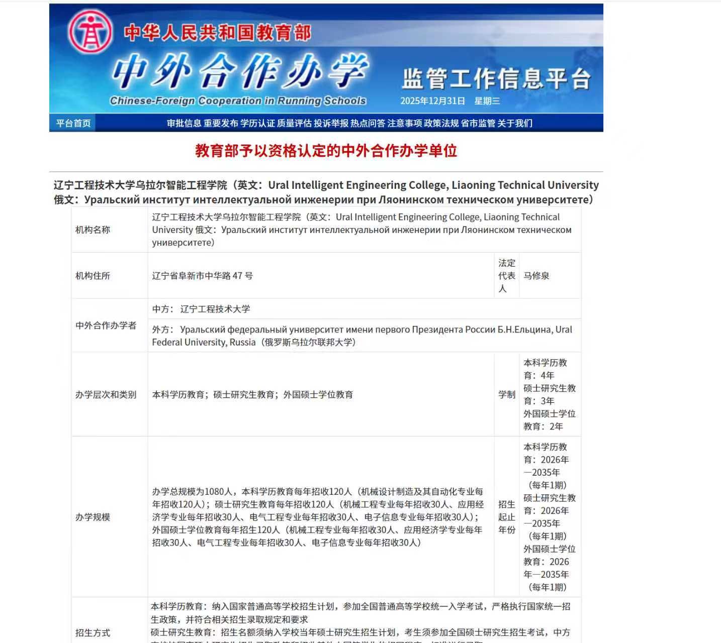 (通讯员 杨桢)近日,我校与俄罗斯乌拉尔联邦大学合作举办的非独立法人中外合作办学机构——“辽宁工程技术大学乌拉尔智能工程学院”经教育部批准正式成立。这是我校首次获批中外合作办学机构,标志着辽宁工程技术大学在中外合作办学领域实现了“从零到一”的根本性突破,在推进高水平教育对外开放道路上迈出了具有里程碑意义的一步。