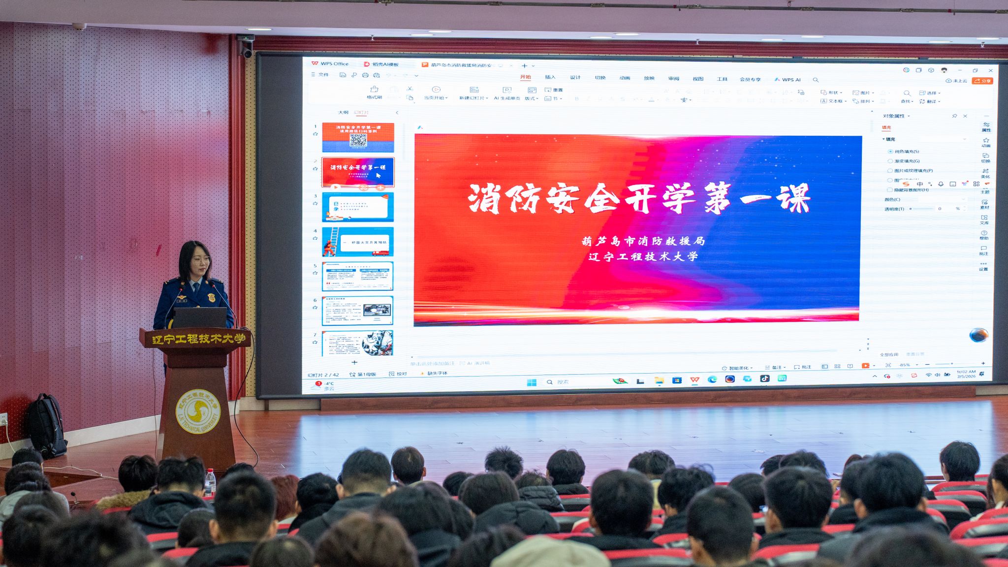 活动伊始,葫芦岛市消防救援局消防讲师团核心讲师王涵为师生带来了一场内容丰富、贴近实际的校园消防知识讲座。他从火灾的常见原因、预防措施、报警流程、初期火灾处置等方面入手,结合真实案例,深入浅出地讲解了消防安全的重要性与实操要点。
