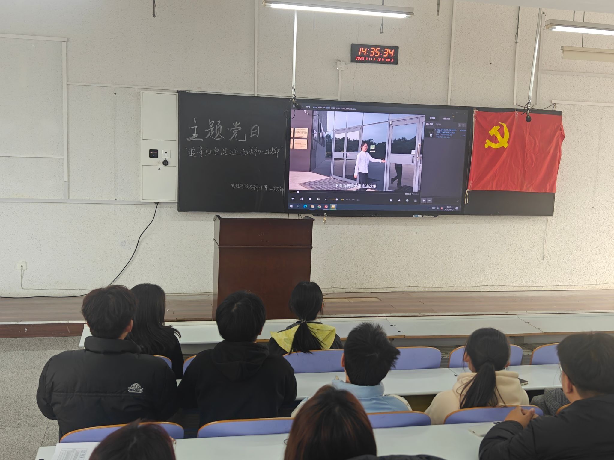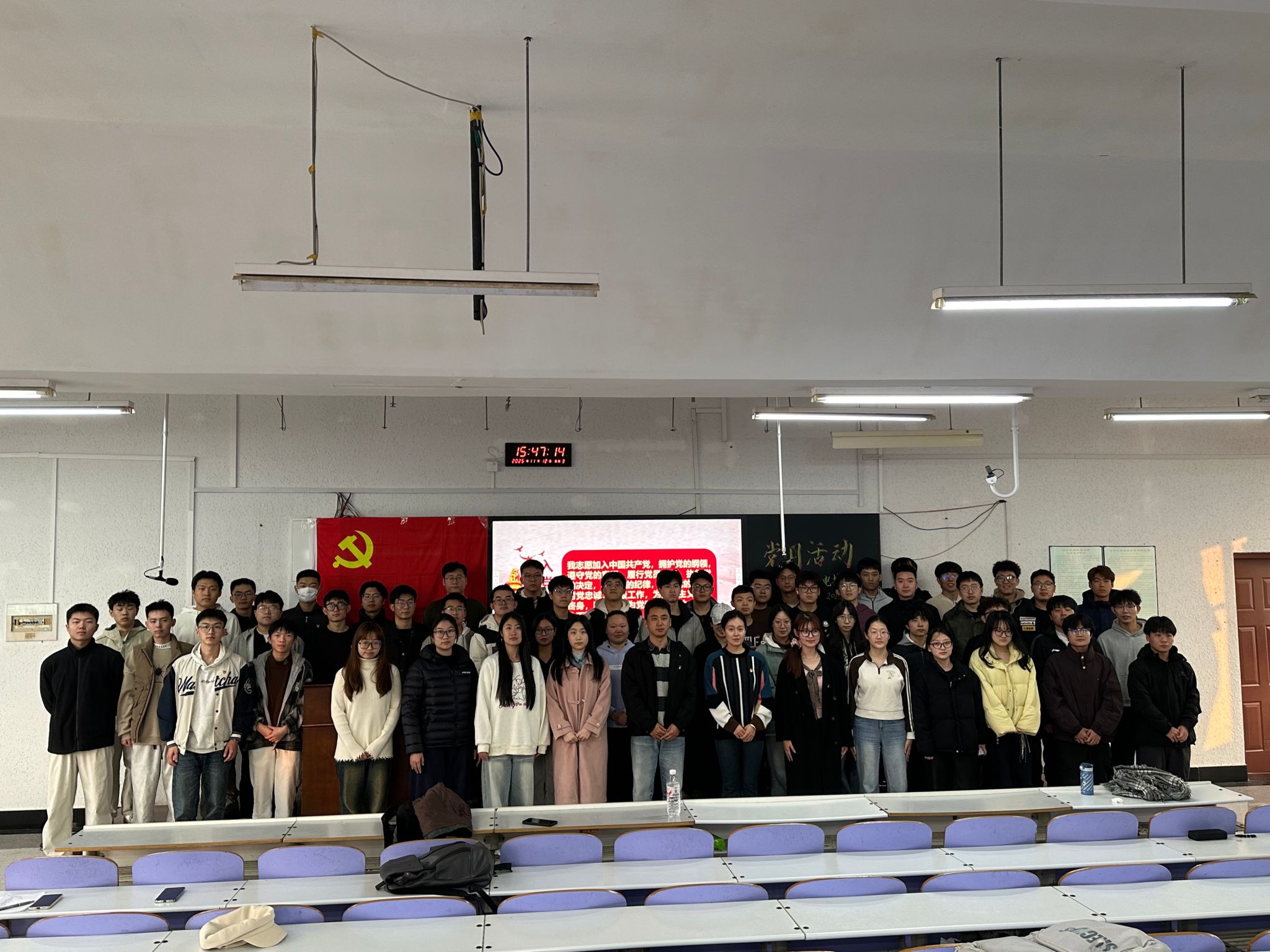 最后,全体人员起立,由本科生第二党支部书记汤文涛老师领誓,面向党旗庄严重温入党誓词,铿锵有力的誓言回荡在教室,唤醒了每一名党员的身份意识与使命担当。